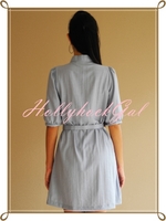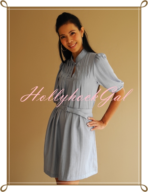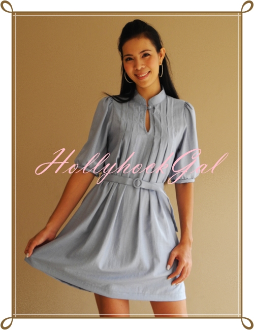 เดรสทรงหลวม คอจีน ตีเกล็ดด้านหน้า แขนพองสามส่วน กระดุมคอ สีน้ำเงินอ่อน พร้อมเข็มขัด ผ้าลินินเส้นเล็กละเอียด ใส่สบายระบายอากาศ  มีซับใน